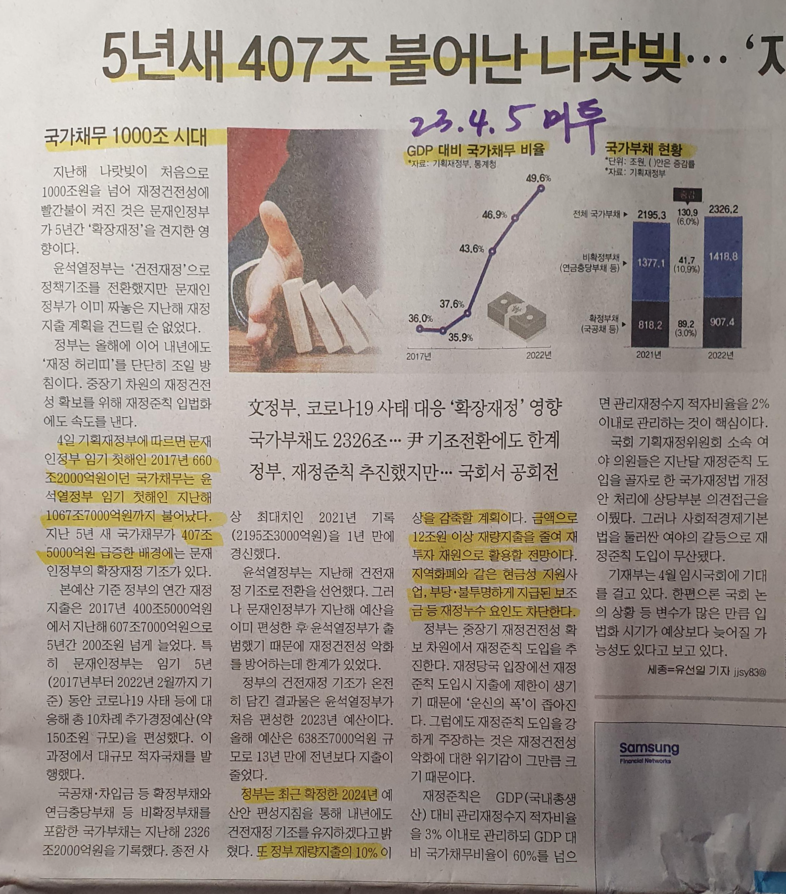 -국가부채 금액 2017년 660조에서 2022년 1067조로 5년 사이 400조 이상 증가함