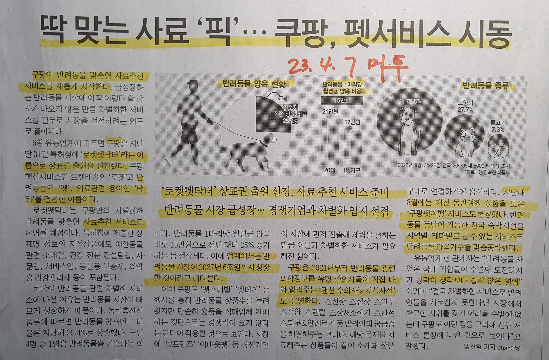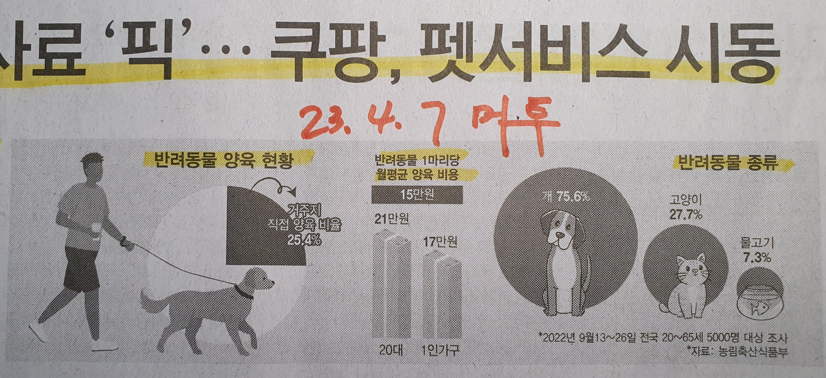 Comment)) 쿠팡에서 이미 2년 전부터 반려동물 시장에 대한 공격적인 투자와 시장 선점을 위해 노력하고 있는 것이 기사를 통해 알게 되었다. 반려동물 종류 또한 과거 개를 제외한 고양이 집사의 큰 증가와 물로 기도 7프로대까지 성장하고 있는 것으로 알게 되었다. 1인가구가 늘어날수록 사람이 아닌 다른 가족을 통해 안정적 삶의 동반자에 대한 수요는 지속적으로 늘어날 것으로 예상된다.